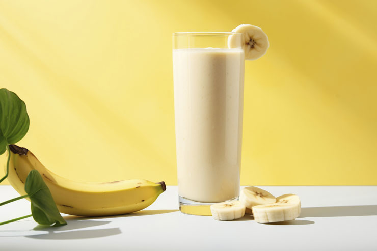 - اخلط الموز، الحليب، العسل، ومكعبات الثلج حتى يصبح المزيج ناعمًا.